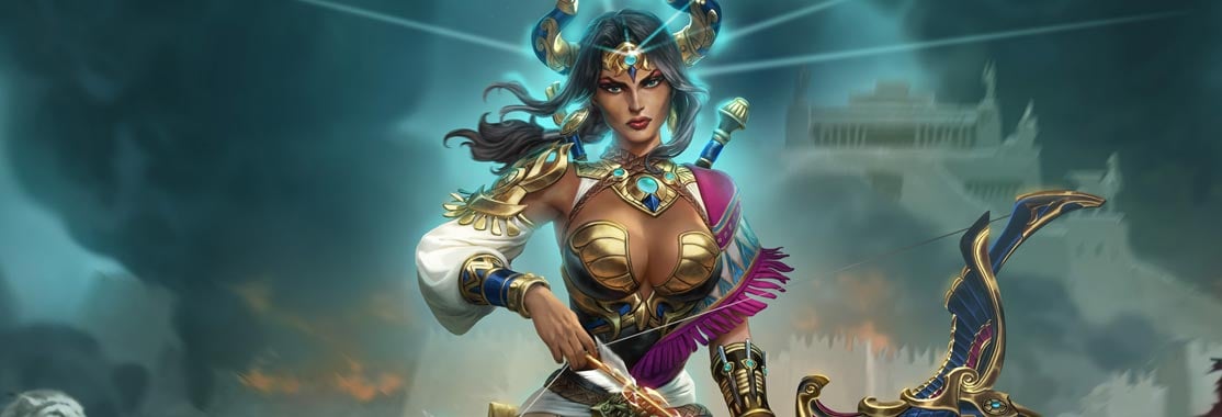 Ishtar draws her blades and charges forward, striking all Enemies in her path. If she hits an Enemy God, she stops and roots them for 1s as she backflips off of them. As Ishtar is in the air, she fires her bow, dealing damage in an area around the affected God. This shot may Crit and trigger Basic Attack item effects.